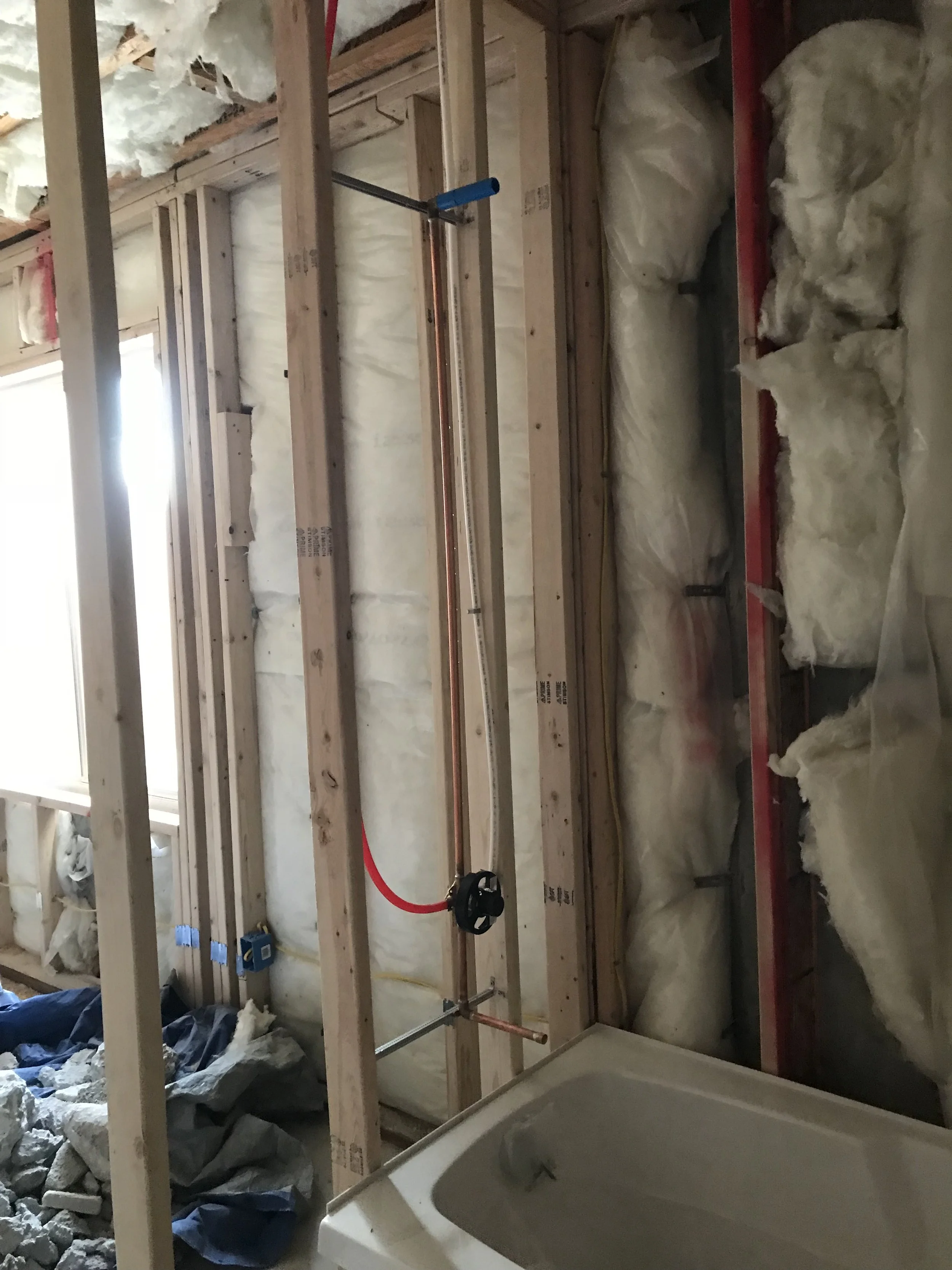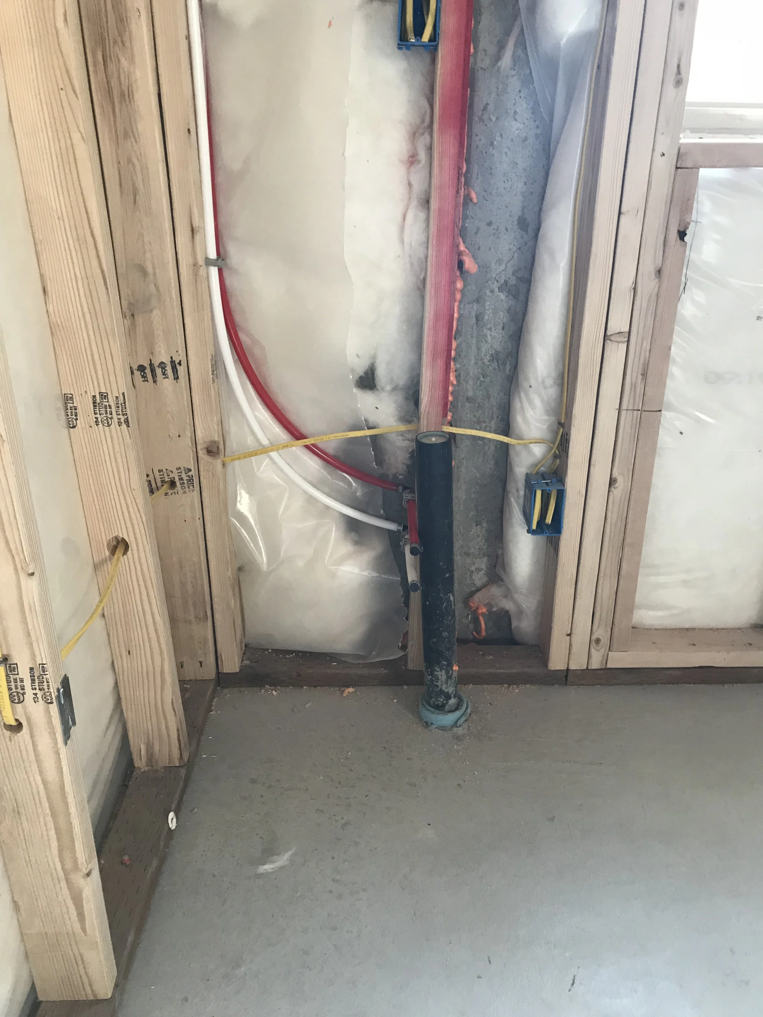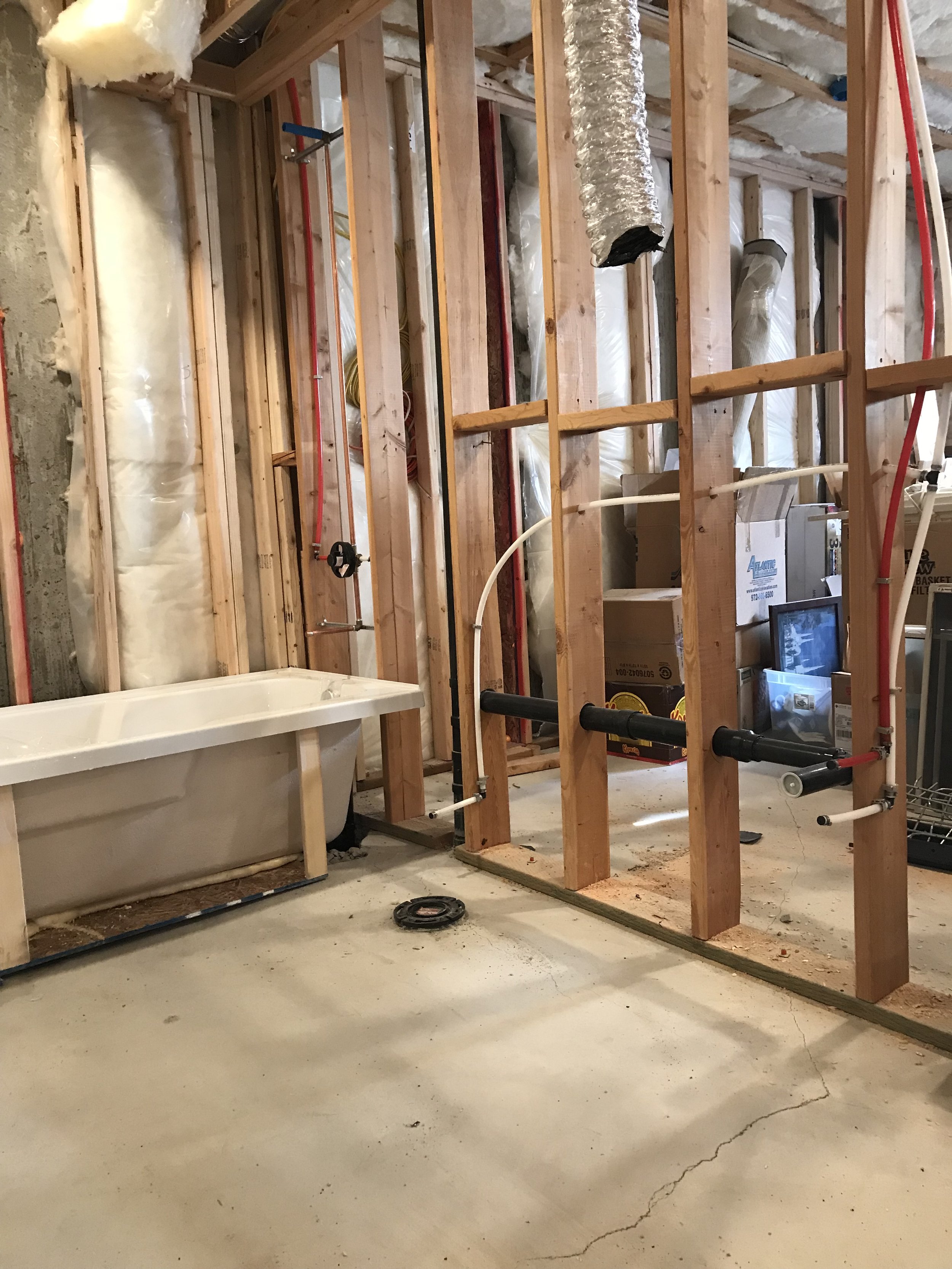 Basic installation of water lines and drainage. Also installation of laundry room floor drain, washer box and tub occur during the rough stage.